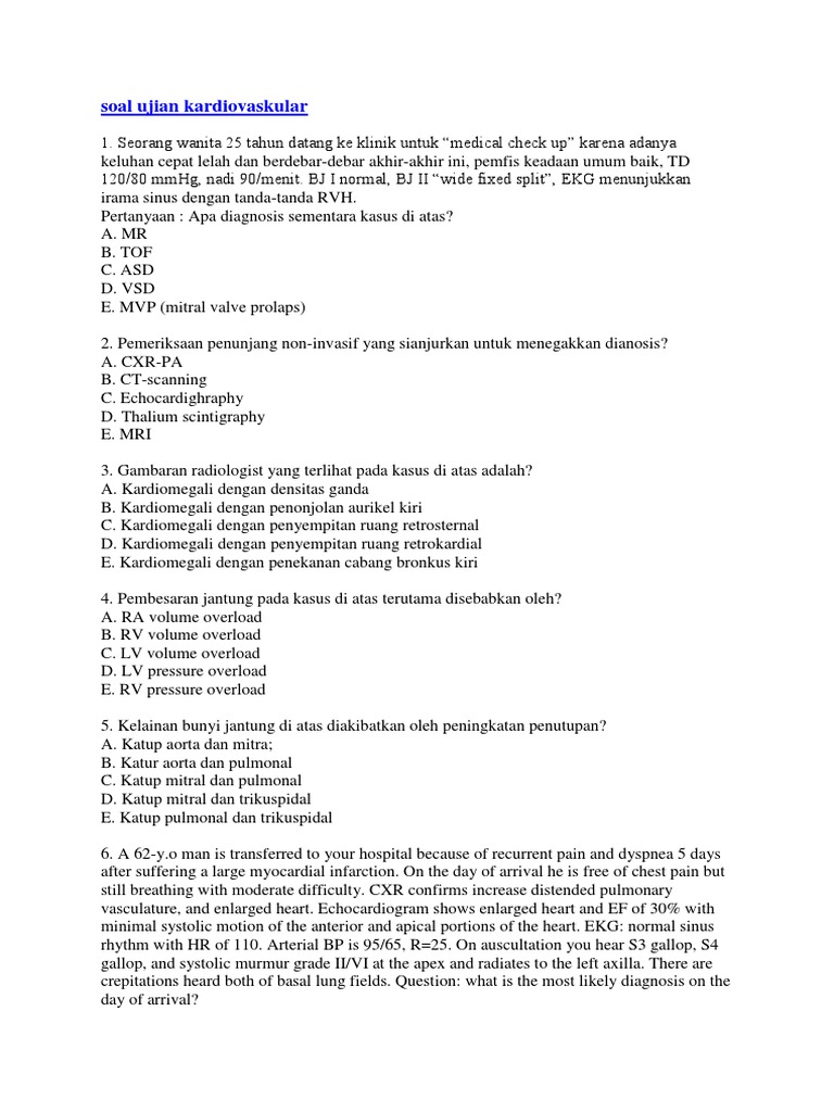Berikut adalah penyakit kardiovaskular dari komplikasi iskemia dan infark, kecuali a. Bila nomor 2 dan 4 benar d. Aug 19, 2020 · contoh soal dan jawaban sistem kardiovaskuler. Seorang wanita, 50 tahun datang ke ugd dengan keluhan sakit punggung tembus ke dada yang dirasakan seperti tertarik atau tersayat, lamanya 5 menit yang kemudian berkurang. Disfungsi otot papilaris * untuk soal 16 30 jawaban berdasarkan : 7 teknik dasar sepak bola yang perlu anda ketahuithe substitution of west in our name replacing cianjur is the result of an agreement we reached with cianjur gardening association following a protest over the original use of cianjur in our name. Ada dua jenis sistem peredaran darah. Keluhan ini dirasakan sejak 3 jam yang lalu. Bagaimana pengaruh hormon erythropoietin terhadap proses pembentukan sel darah merah? Aug 28, 2013 · contoh soal ujian final kardiovaskular. Soal ukom dan kunci jawabannya ii suara literasi perawat indonesia. Soal ukom dan kunci jawabannya ii suara literasi perawat indonesia. Latihan soal sistem kardiovaskuler jawablah pertanyaan berikut ini dengan benar a.